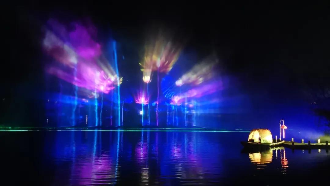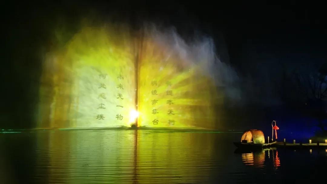 拈花塔利用光影打造了一個禪意空間,拈花湖上也在上演著一幕東方禪意畫卷。由兩臺16,000流明的松下液晶激光系列工程投影機PT-SMZ16KCL,打造的寬22米、高13米的水幕投影,也是這里的代表性項目之一。