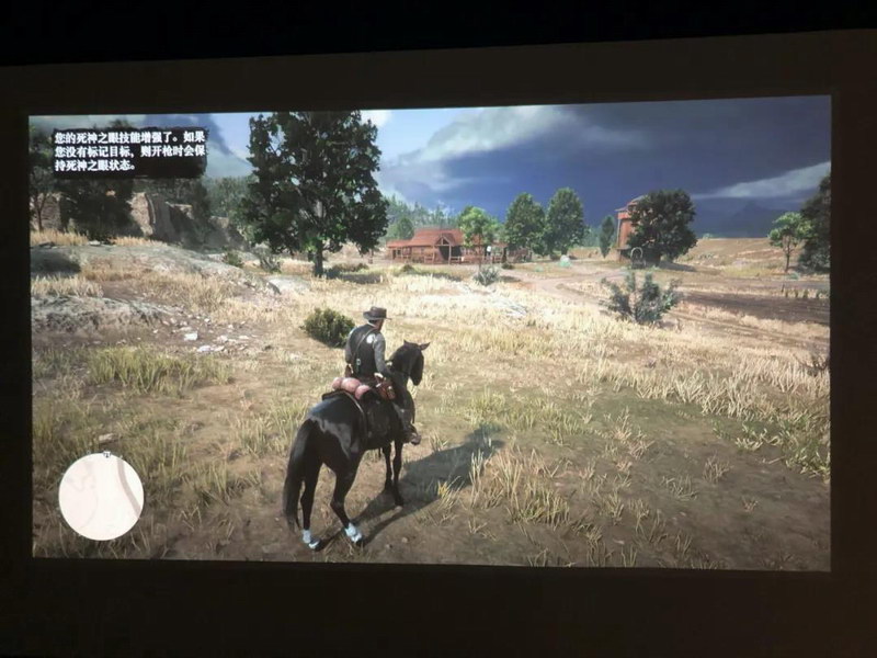 不僅如此,它支持HDR10和HLG,增強對比度,充分展現暗部和亮部細節。打開4K投影機的HDR模式后,《荒野大鏢客2》逆光場景非常通透,主人公亞瑟騎馬奔走于草原上,陽光從山崖間穿過,光暈過渡自然,逆光的草葉也很清晰,畫面壯美。