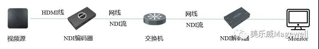 通過HDMI線將視頻源連接至美樂威NDI編碼器,NDI編碼器和解碼器通過交換機都接入局域網,NDI解碼器解碼后的圖像顯示在顯示器上。