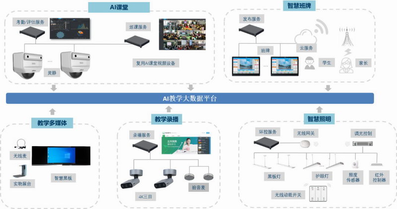 大華智慧教室解決方案,以智慧教學空間和信息化平臺為核心,AI課堂、智慧班牌、教學多媒體、教學錄播和智慧照明五位一體,實現全媒體、全覆蓋、全聯動、交互一體的融合教學模式。