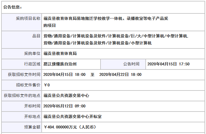 > 福貢縣教育體育局易地搬遷學校教學一體機、錄播教室等電子產品采購項目招標公告