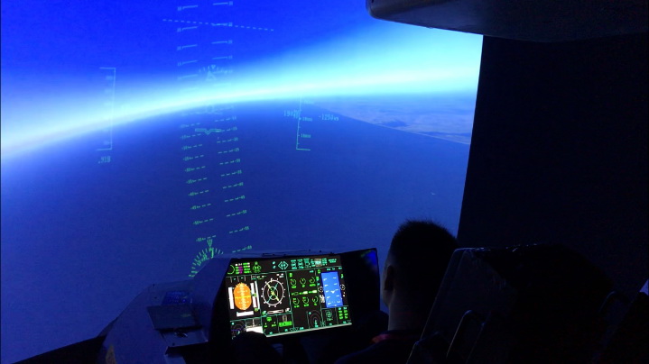 飛行影院方案(半球球幕)主要應用于大型主題樂園的虛擬飛行項目中,將半球幕旋轉 90 度豎立起來。觀眾懸空于球體內部,屏幕圖像覆蓋視野范圍。飛行影院切合人類的視覺習慣,所呈現影像一般采用全景魚眼鏡頭拍攝,體驗者如同懸空遨游。
