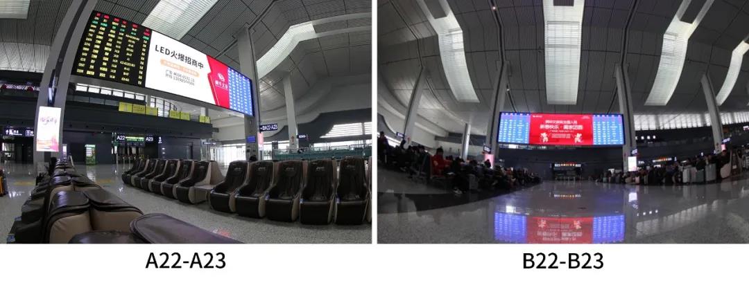 屏體主要安裝在車(chē)站候車(chē)大廳南、北兩側(cè)和東、西兩側(cè),A2-A3、B2-B3、A22-A23、B22-B23四個(gè)進(jìn)站口的立柱間上方,使用多達(dá)1200個(gè)KL2.5箱體,總面積達(dá)369㎡。