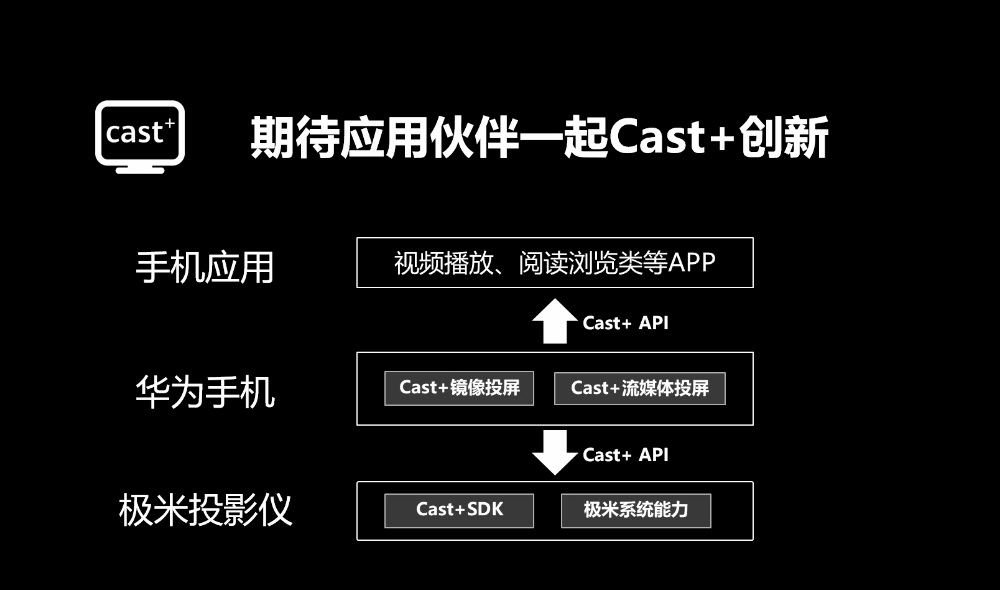 Cast+通過以華為手機為中心,以鏡像投屏和流媒體投屏技術為載體,為手機應用和極米投影設備建立了連接的橋梁,高清流暢的大屏體驗將為手機的應用提供無限的想象空間。