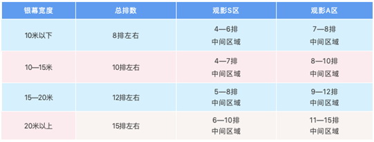最佳觀影位置需綜合考慮視覺和聽覺兩方面因素,在此區域內觀影,既能讓觀眾獲得絕佳的視覺臨場感,也能避免回聲、聲聚焦等聲學缺陷,擁有更具層次、更立體的聽覺體驗。最佳觀影區域的位置通常根據影廳大小而有所差異,具體可參考下表: