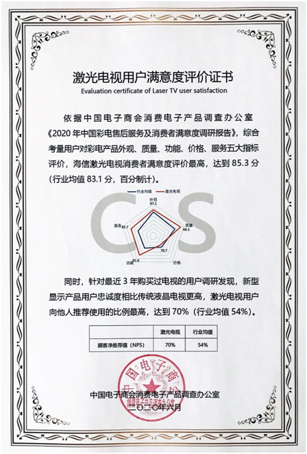 6月3日,中國電子商會正式發布了《2020中國彩電售后服務和消費者滿意度調研報告》。該報告顯示,綜合考量用戶對彩電產品外觀、質量、功能、價格、服務五大核心指標的評價,海信激光電視消費者滿意度評價最高,達到85.3分。