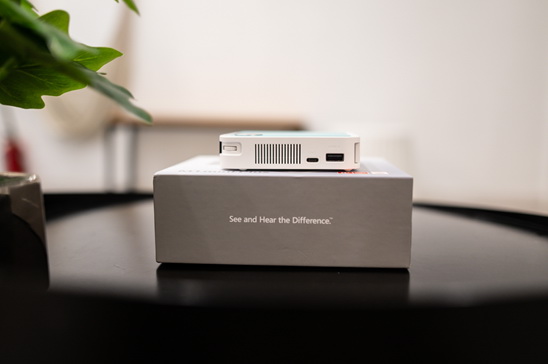 整個投影儀非常小巧,一點不像印象中的投影儀非常笨重,屬于那種隨手裝入包中不會帶來負擔的體積,而且在外觀上也非常時尚,很難讓人想到是一個投影儀,尤其在搭配亮眼一點的顏色,顏值絕對是加分的,畢竟榮獲了iF外形設計大獎。