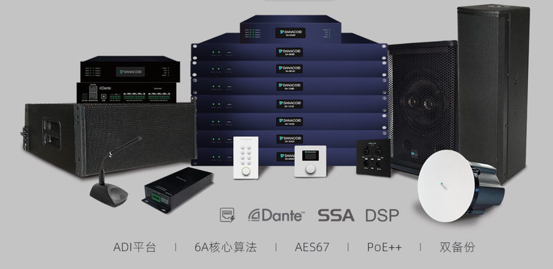 DANACOID 全網絡化音頻系統DynePro,系統產品采用Dante數字音頻傳輸協議,結合自主研發的數字音頻處理器為核心向周邊拓展,將傳統的麥克風、接口機、音箱轉變成在Dante傳輸的產品,從而實現整個系統AoIP的布局。