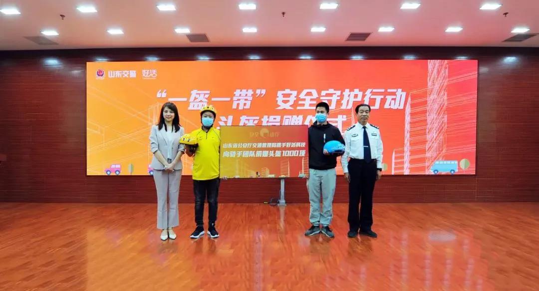 活動現(xiàn)場,山東省公安廳交通管理局聯(lián)合愛心集團,現(xiàn)場為廣大騎手捐贈1000個安全頭盔,山東省快遞行業(yè)協(xié)會向全省摩托車、電動自行車騎乘人員和汽車駕乘人員發(fā)出倡議,提醒騎乘人員帶好頭盔、系好安全帶。