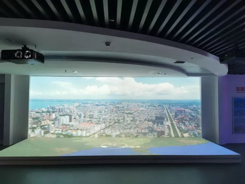 展廳使用Vivitek(麗訊)7臺RU70953工程投影機,打造沙盤及墻面聯動展示,選用素模沙盤與前方屏幕聯動,帶領訪客體驗一場未來游園。