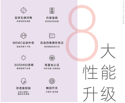 在性能上,G9針對對焦模式進行了全面升級,采用全新的實時無感對焦,無論是開機還是移動設備,畫面都可自動對焦、秒清晰。堅果G9的ToF激光實現秒速對焦,采用了CMOS攝像模組,新增高靈敏的攝像頭,可感知全局畫面,適合調整對焦精度。還有低藍光認證、自動四角梯形校正、雙語音控制、25dB低風噪,給消費者帶來更優質的觀影體驗,G9投影儀無疑成為目前市面上當之無愧的優選消費級投影儀產品。
