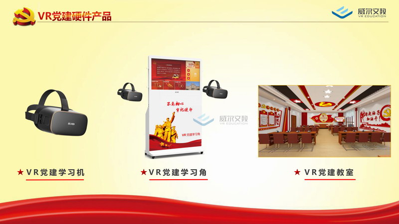 威爾文教VR黨建學習系列產品包括VR黨建學習機、VR黨建學習角、VR黨建教室三大系列產品。用戶可以根據使用場景等需求進行自由選擇。產品配備建黨100周年、建國70周年、革命戰爭、革命圣地全景展示等內容,充分滿足黨員和群眾的學習體驗需求。