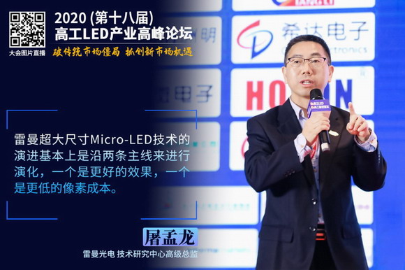 雷曼光電技術(shù)研究中心高級(jí)總監(jiān)屠孟龍帶來(lái)《超大尺寸Micro LED技術(shù)的演進(jìn)》主題演講,分享雷曼光電Micro LED技術(shù)應(yīng)用方向、雷曼Micro LED技術(shù)發(fā)展進(jìn)程、COB顯示技術(shù)優(yōu)勢(shì)、COB的幾種封裝方案、超大尺寸顯示市場(chǎng)等。同時(shí)透露雷曼仍在繼續(xù)進(jìn)行產(chǎn)品迭代,P0.4和P0.3的超高清顯示產(chǎn)品可能在明年1季度和4季度會(huì)與廣大客戶朋友們見(jiàn)面。