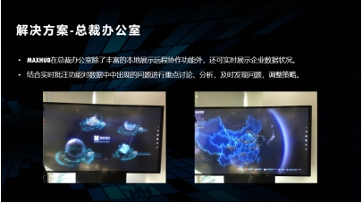 引入MAXHUB以后,覆蓋互動洽談區和高級會議區的MAXHUB不僅能夠通過中控電腦同時控制,播放同一視頻或圖片資料,提升企業形象宣傳效果,同時也改變了原有的業務執行和團隊協作的方式。智能會議平板借助無線投屏為設計師們提供了更具視覺表現力的方案展示舞臺,可隨時批注的功能在業務溝通時大大增強客戶的參與感,使得成交率節節攀升。此外,設計圖、會議紀要掃碼保存推動無紙化辦公模式,遠程視頻會議有效降低了總公司與各分公司之間的差旅支出,有效降低了企業運營成本。
