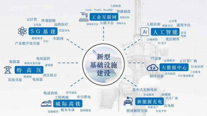 “新基建”全稱為“新型基礎設施建設”主要包括5G基站建設、特高壓、城際高速鐵路和城市軌道交通、新能源汽車充電樁、大數據中心、人工智能、工業互聯網七大領域 ,是以新發展理念為引領,以技術創新為驅動,以信息網絡為基礎,面向高質量發展需要,提供數字轉型、智能升級、融合創新等服務的基礎設施體系。