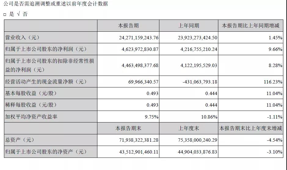 報告期內,公司實現營業收入242.71億元,比上年同期增長1.45%;實現歸屬于上市公司股東的凈利潤46.24億元,比上年同期增長9.66%。公司2020年上半年毛利率為49.76%,比上年同期提高3.43個百分點。