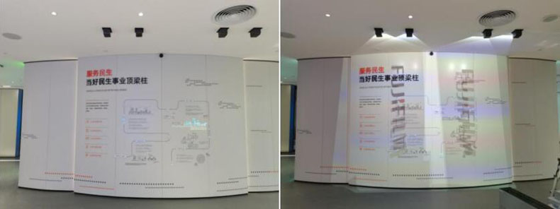 負責展廳設計和內容制作、深圳驕陽視覺創意科技股份有限公司技術總監彭云先生表示:“在搭建過程中,我們遇到很大困擾,普通投影機無法滿足空間層高和畫面長寬比,而富士膠片FP-Z5000則可以完全適配環境所需,獨具一格的旋轉鏡頭讓我們的隱藏式設計得以實現,富士膠片官網提供了專業的模擬器工具,通過模擬計算的數據,我們最終選擇了這款產品,現場安裝與調試也令人滿意,項目難點得以攻破。我們很期待在未來的項目中應用富士膠片投影機創造更多精彩項目。”