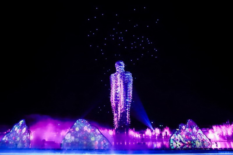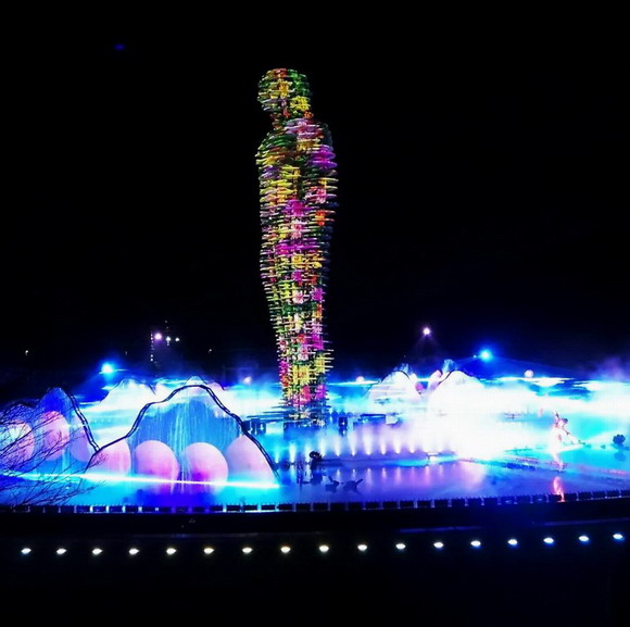 在雕塑所處的廣場(chǎng)上設(shè)置了噴泉和表演水臺(tái),當(dāng)演出者在水臺(tái)上表演時(shí),水臺(tái)上的投影便會(huì)營造出“水上行走”的夢(mèng)幻效果。