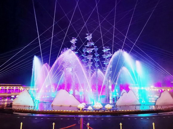 整個(gè)演出,通過水下舞臺(tái)裝置、全息數(shù)字影像屏、霧森、景觀環(huán)境藝術(shù)照明和高流明激光投影五大視覺演繹手法,實(shí)現(xiàn)了舞臺(tái)演出與現(xiàn)實(shí)景觀的完美結(jié)合。
