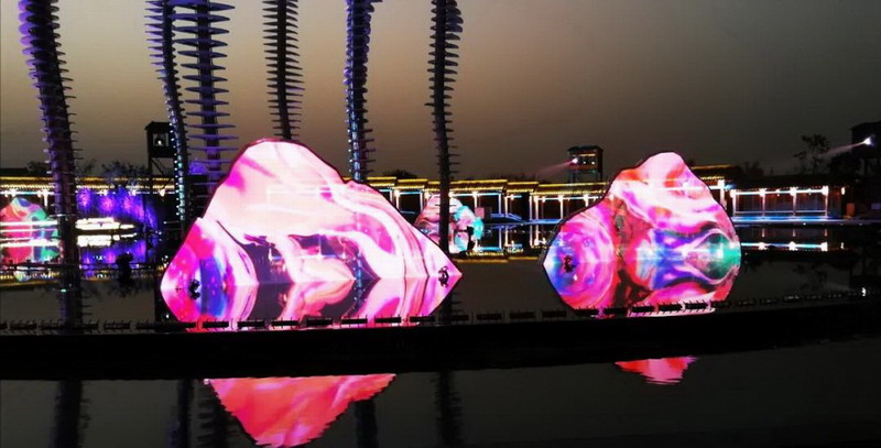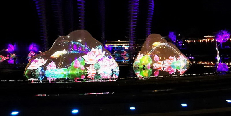 在整個(gè)項(xiàng)目中,贏康負(fù)責(zé)了18米高的金屬鏤空動(dòng)態(tài)雕塑投影,這種大型金屬活動(dòng)結(jié)構(gòu)投影國內(nèi)罕見。另外還負(fù)責(zé)了十座特殊紗幕投影以及水下水臺(tái)投影,共提供了十余臺(tái)3萬流明的激光投影機(jī),完成了特殊造型、特殊介質(zhì)的挑戰(zhàn)性投影工作。