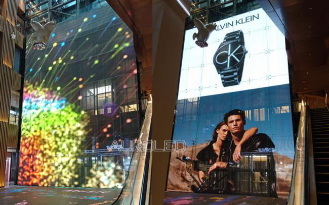平面廣告的展現方式有很多,電梯廣告也是其中的一種。尤其是商場中的觀光電梯,由于位置搶眼,且人們在等待電梯時通常處于意識放空的狀態,若廣告視覺沖擊力強,則廣告效果絕對是非常好的,想不抓住消費者眼球都難。而LED透明屏在觀光電梯的應用不僅提高了觀光電梯的商業價值,更是讓其變得既有趣又好玩。