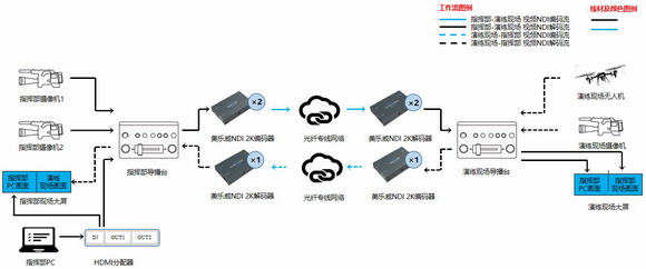 內江日報社根據項目采購了若干美樂威NDI編解碼器,并部署到應急演練網絡傳輸項目中。在應急指揮部,2臺美樂威Pro Convert NDI編碼器用于連接電腦PPT畫面及導播臺切換的攝像機畫面,1臺Pro Convert NDI解碼器連接室內的顯示屏,接收演練現場發送過來的視頻畫面;演練現場的部署略有不同,報社安裝了1臺Pro Convert NDI編碼器,用于連接導播臺切換的畫面,2臺NDI解碼器連接分別連接顯示屏,播放應急指揮部發送過來的PPT畫面和視頻畫面。以上6個編解碼器都連接到本地千兆交換機,通過點對點光纖專線進行互聯傳輸。現場的音頻信號也通過NDI協議傳輸,并通過HDMI音頻分離器在本地播放。這樣的方案搭建順利演繹了一場科學高效的衛生防疫處置行動,達到了預期效果。