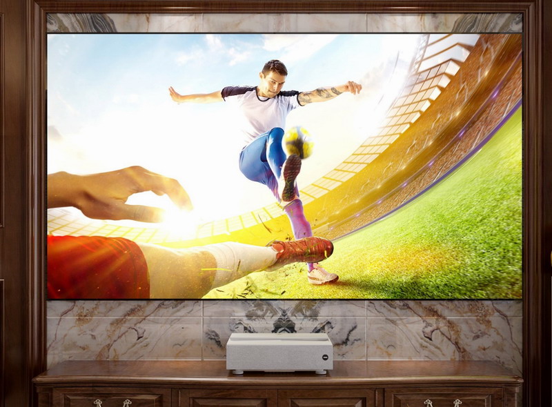 為了環境美觀,激光電視需要放在客廳電視柜上,比如明基最新款激光電視,投射比為0.252,投影距離50cm不到,短焦功能,減少客廳人員走動帶來的干擾,也減少本身光線損耗。普通投影儀多在影音室,一般吊裝,2-3米投100英寸。