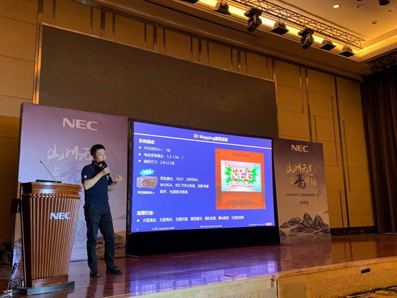 授牌儀式過后,NEC投影機產品經理張凱向大家翔實地介紹了移動式全景投影、全息紗幕投影、立體模型投影等新品解決方案。現場,醒目又炫酷的“NEC”LOGO格外吸睛,運用2萬流明英雄系列PX2000UL+ 雙色激光工程投影機,將品牌標志做出繽紛絢麗的動態效果。