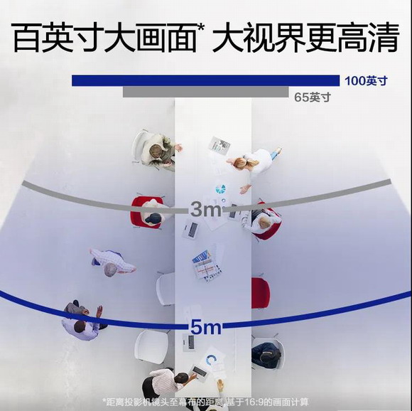 對于大中型會議來說,讓處于不同位置的與會者都能清晰看到投影內容非常重要。相較于65英寸的小屏幕,超百英寸畫面可以讓更多與會者看清屏幕內容,而且不存在反光問題,無論哪個角落都能將投影內容一覽無余,充分滿足中大型會議室的顯示需求。
