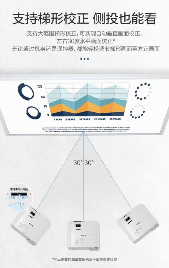 投影畫面的調試通常需要耗費比較多的時間,特別是投影機無法垂直正面擺放時,更是令人頭大。全新的愛普生商用投影機均支持梯形校正,即使不正對投影幕布或墻壁,從側面也可輕松投出方正畫面。配備的水平梯形校正滑鈕,一“指”完成畫面調節。讓投影不受空間限制,實現更靈活的擺放。