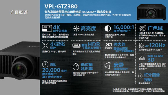 8月初,索尼4K激光高亮投影機(jī)旗艦機(jī)型VPL-GTZ380驚喜發(fā)布,其強(qiáng)勁的性能將為各行業(yè)客戶提供令人驚嘆的影像和沉浸式的觀看體驗(yàn)。