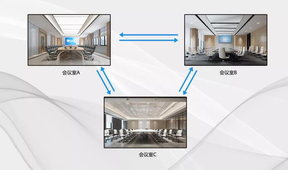 可實現多個會議室多臺主機之間音視頻信號的互聯互通,打破信息壁壘。僅需中控編程發送指令即可輸出對應各會議室的信號達到互通效果 。