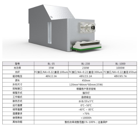 傳統的工業加工、切割一直是紅外激光的天下,但隨著5G應用、新能源汽車等行業的發展,針對越來越多的有色金屬加工需求,紅外激光漸顯不足。藍光激光波長短,有色金屬的對藍光的吸收率超紅外最高可達20倍,因此大功率的藍光激光模組需求短缺。BL系列產品可實現從35W到上千W的光功率輸出,在鋰離子電池、電子產品封裝、汽車制造、激光熔覆、表面強化處理等領域有著廣泛的應用。