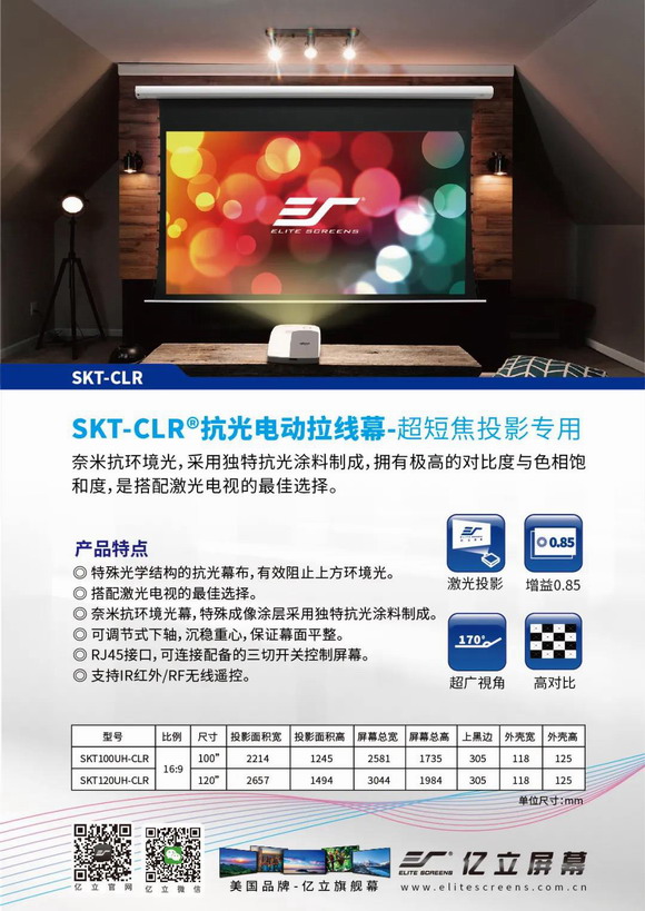 本屆展會億立屏幕也將如約而至,頂級影院專用投影幕-黑耀9抗光幕、超短焦投影專用-SKT-CLR抗光電動拉線幕將悉數亮相。本屆展會產品新穎,亮度不斷。億立屏幕與您相約上海新國際博覽中心,展位號W4A09,期待您的光臨!!以下是展出的兩款產品的特點和相關數據介紹。