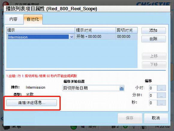 時間偏移必須距離正片開始或結(jié)束時大于 60 秒。如果輸入的時間偏移值較低,編輯播放列表項目窗口中將出現(xiàn)一條錯誤消息。