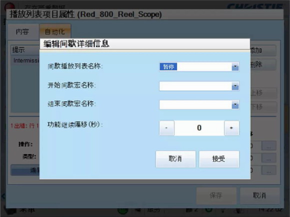 例如“Intermission Play List Name”選擇第 1 步中建立的播放列表“暫停”,“Start Intermission Macro Name”選擇“開燈”,“End Intermission Macro Name”選擇“關(guān)燈”,這樣在播放暫停時影廳會自動亮燈,結(jié)束后會自動熄燈。“功能繼續(xù)偏移”為回放暫停之前的內(nèi)容,最多不超多 30 秒。設(shè)置完成后,點擊“接受”。