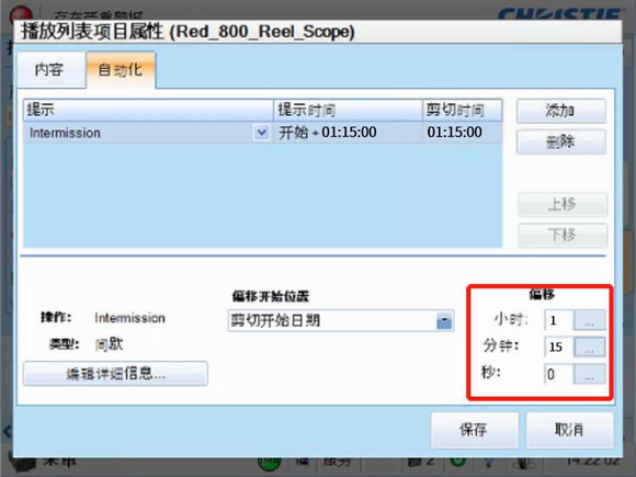 7 在“偏移開始位置”下拉列表中選擇“剪切開始日期”。在“偏移”區(qū)域中選擇時間偏移。根據(jù)影片和影院的實際情況,設(shè)定暫停時間點,也就是影片播放到什么時候,會暫停并播放場間短片。假如在一部時長 2 小時 30 分鐘的正片中添加停頓,您可以在“小時”字段輸入“1”,在“分鐘”字段輸入“15”。