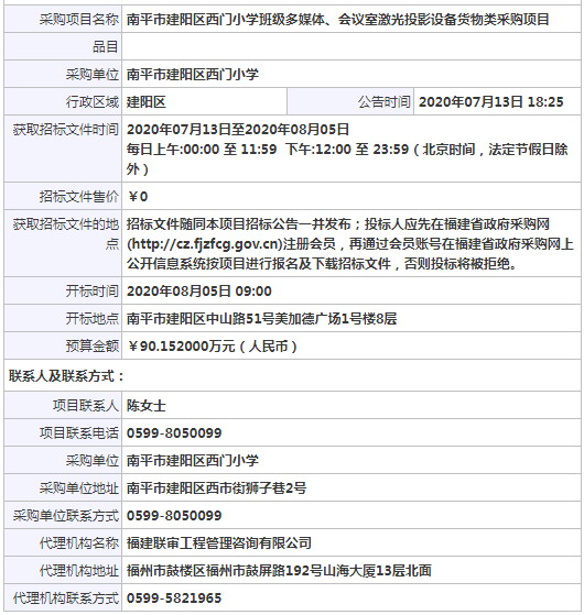 南平市建陽區西門小學班級多媒體、會議室激光投影設備貨物類采購項目招標公告