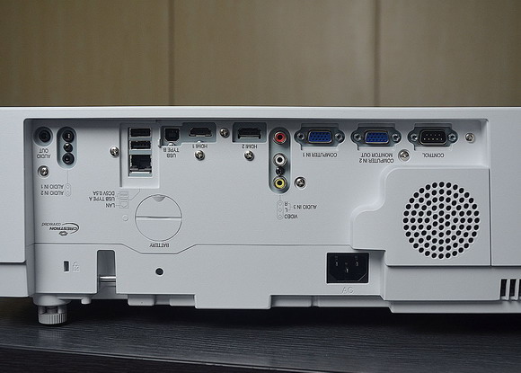 SNP-MW380UT通體白色,外觀設(shè)計感十足,棱角走位勻稱。機身整潔,布局合理,按鍵區(qū)位于機身正面,接口位于尾部,無論正投還是吊裝都很順手。接口包含2個HDMI高清接口、2個USB接口、VGA in/out接口、RS-232控制接口、網(wǎng)絡(luò)接口、音頻接口等等,滿足各類設(shè)備的接入,也支持對多房間投影機的統(tǒng)一管理。