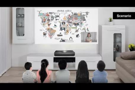 以2500流明高亮度,再配置超短焦鏡頭,激光電視X1-Elite在距離墻面25.6CM的位置就能投射100吋圖像,簡(jiǎn)單調(diào)整激光電視X1-Elite到墻壁的距離,即可投出最大120吋的高清大畫面。在靜態(tài)情況下這種貼墻放置效果,也為客廳、為工作空間營(yíng)造出一種清爽、大氣氛圍。