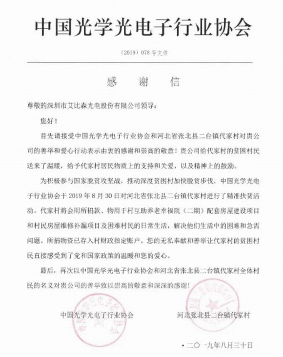 順應國家政策,積極響應號召,2019年艾比森與中國光學光電行業協會一起,參與到了幫助代家村的扶貧行動中。為積極參與國家脫貧攻堅戰,推動深度貧困村加快脫貧步伐貢獻力量。