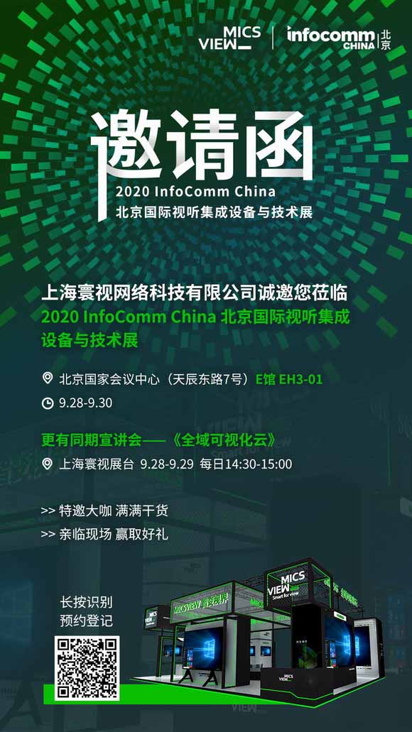 2020年9月28-30日,北京國際視聽集成設備與技術展(IFC2020) 將在北京國家會議中心舉辦。上海寰視作為深耕專業視聽領域十年的智慧視聽解決方案提供商,將在本次展會上重磅推出MICS全域可視化云戰略。