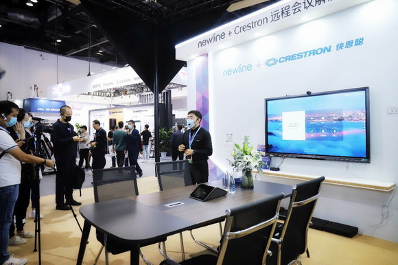 newline+Crestron遠程會議解決方案,將辦公區(qū)打造成為一個集智慧、工作、會議與協(xié)作為一體的空間,在這里,觀眾了解先進的中控系統(tǒng)、一鍵入會、無線投屏等實用功能。