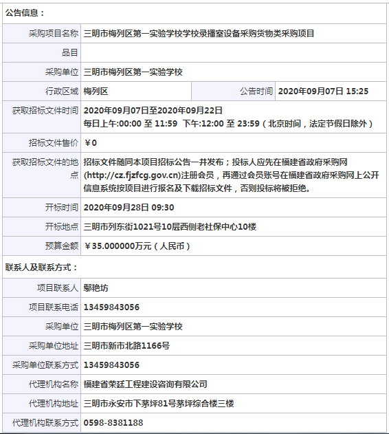 采購項目名稱: 三明市梅列區第一實驗學校學校錄播室設備采購貨物類采購項目