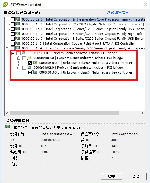 (3)進入配置界面后,如圖4所示勾選添加Unknown <class> Multimedia video controller的兩個PCI設備,點擊確定。(服務器端安裝的是美樂威Pro Capture Dual HDMI 采集卡,所以此處顯示兩個PCI設備,代表這片卡上的兩個采集通道)。