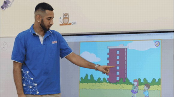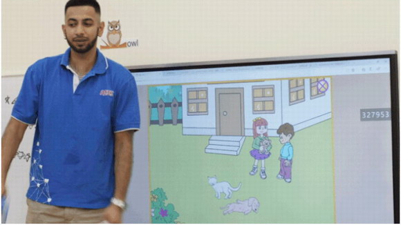 “因為愛貝的學生用書的是比較小的,如果在實際的課堂當中,把課本直接展現給小朋友看,可能會出現看得不太清晰的情況!比缃,Miya會把課程動畫導入希沃一體機,讓每個小朋友都看清所學知識,通過小故事引入,順利展開情景教學!斑@樣一來,我們今天要上的什么內容,小朋友可以很清楚地知道了。 ”