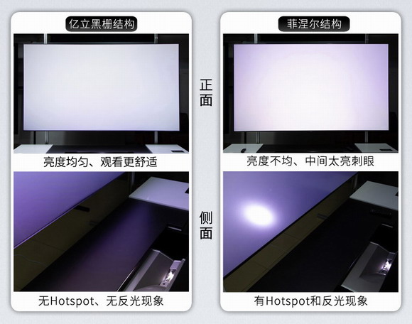 菲涅耳屏幕抗光效果好,但是可視角度小。并且由于光學結(jié)構更為復雜,只能做成不能卷曲的硬屏。無論是運輸還是安裝難度都會比黑柵幕布要高上不少,所以其目前市售最大尺寸也只有100英寸。同時由于將從屏幕兩側(cè)的光線進行了吸收處理,所以菲涅爾的可視角度相對黑柵幕也有非常大的縮減。