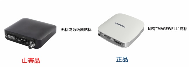 【辨識方法】美樂威capture系列采集盒產品外觀上均印有“MAGEWELL”商標,且為白色。如無此商標信息或是其他紙質貼標,則非正品。