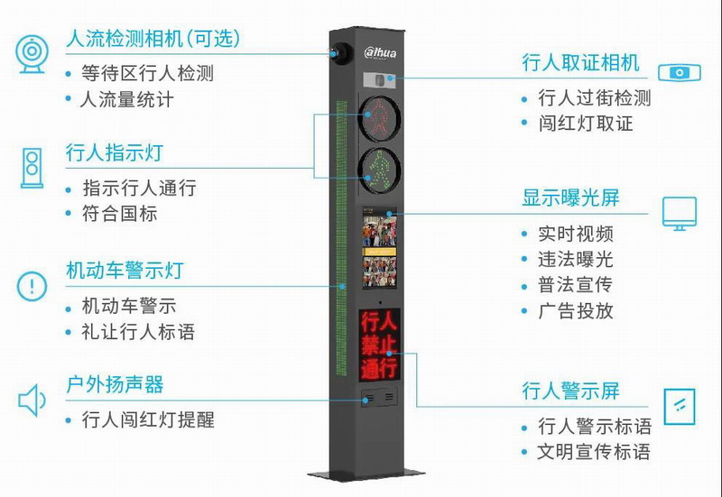 大華股份全新“行人衛士”智慧行人一體燈集人行橫道信號燈、警示標語顯示屏、機動車警示屏、行人闖紅燈抓拍曝光系統、智能行人請求系統、語音提示系統六大功能于一體,有效警示行人違法闖紅燈行為;采集行人流量數據,優化行人通行配時