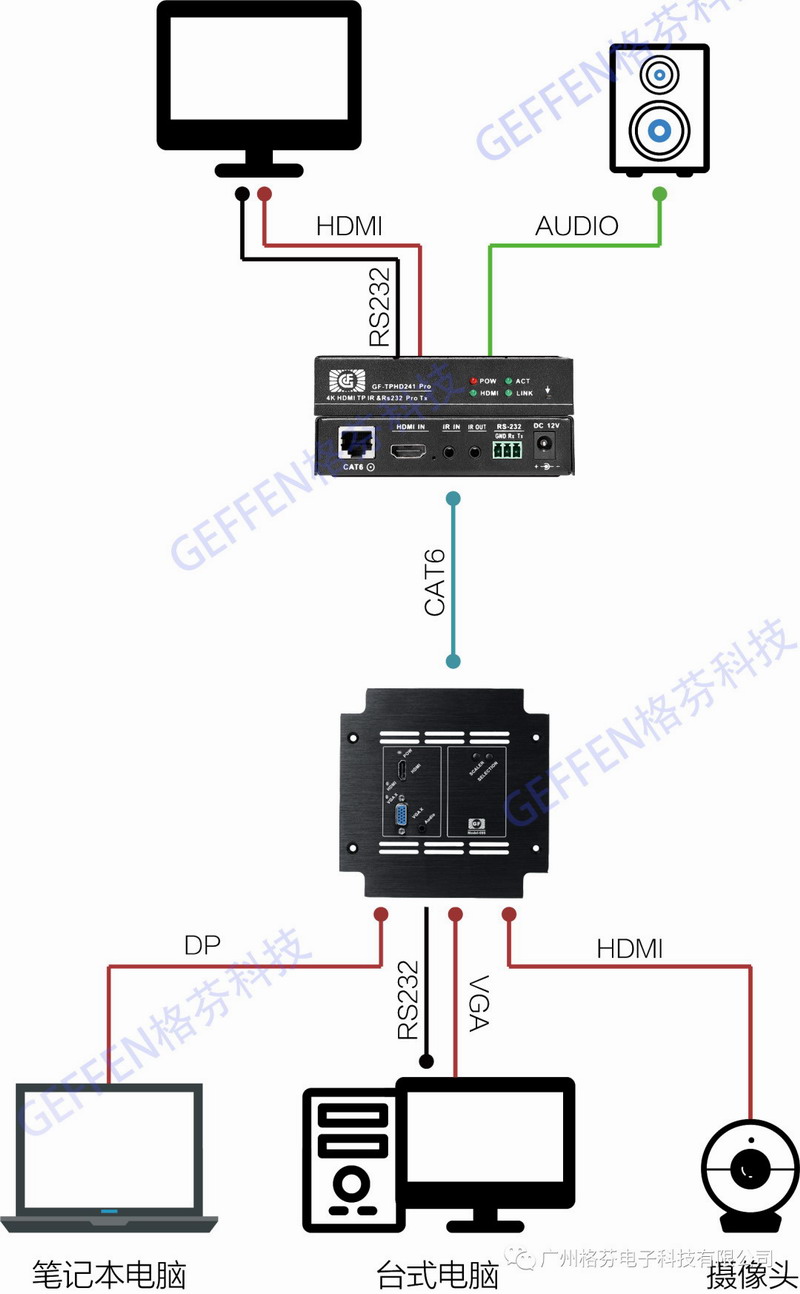 GEFFEN格芬科技的GF-TPHD系列產品采用 HDBaseT 的傳輸方式,實現了對視、音頻信號的高保真傳輸,避免了信號在傳輸過程中的流失,通過一根網線傳輸信號的方式,減少了現場布線麻煩,節省了成本。采用嵌入式的安裝方式,與周圍環境融為一體,使得整體布局比較整潔、簡單,本產品采用機箱式設計,規范式的設計讓產品安裝更為簡單快捷,使得產品得到有效的保護。